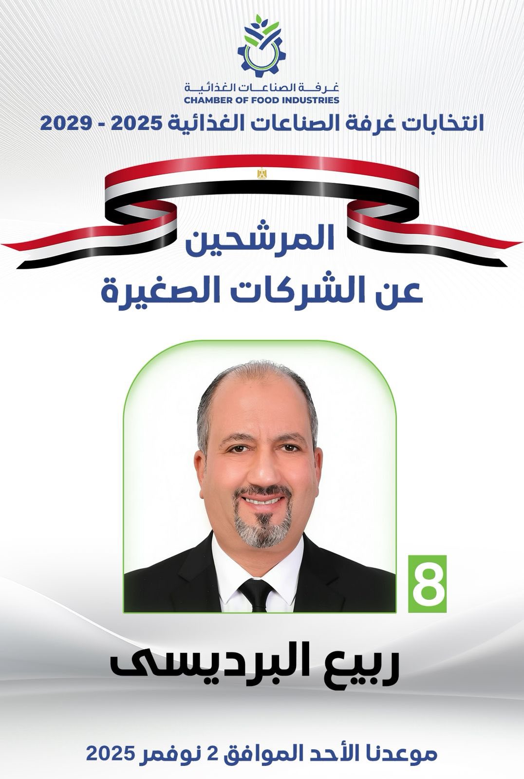 أعلن المهندس ربيع البرديسي، رئيس مجلس إدارة شركة وايت جولد للصناعات الغذائية، ترشحه رسميًا لانتخابات غرفة الصناعات الغذائية باتحاد الصناعات المصرية على فئة المشروعات الصغيرة، والمقرر عقدها يوم الأحد 2 نوفمبر 2025، ضمن الدورة الجديدة لمجالس إدارات الغرف الصناعية 2025 / 2029.