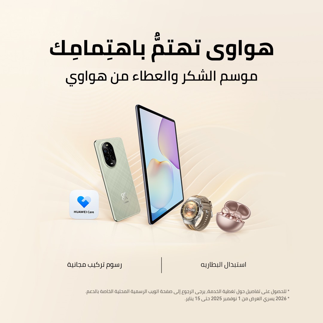 ويمكن لعملاء هواوي أيضًا الاستفادة من العروض والخصومات خلال حملة موسم الشكر، بسهولة من خلال خدمة “من الباب إلى الباب”، التي توفرها الشركة دون أي مصاريف شحن، مما يضمن تجربة مريحة وسريعة للحصول على خدمات الصيانة، دون الحاجة إلى زيارة مركز الخدمة شخصيًا.