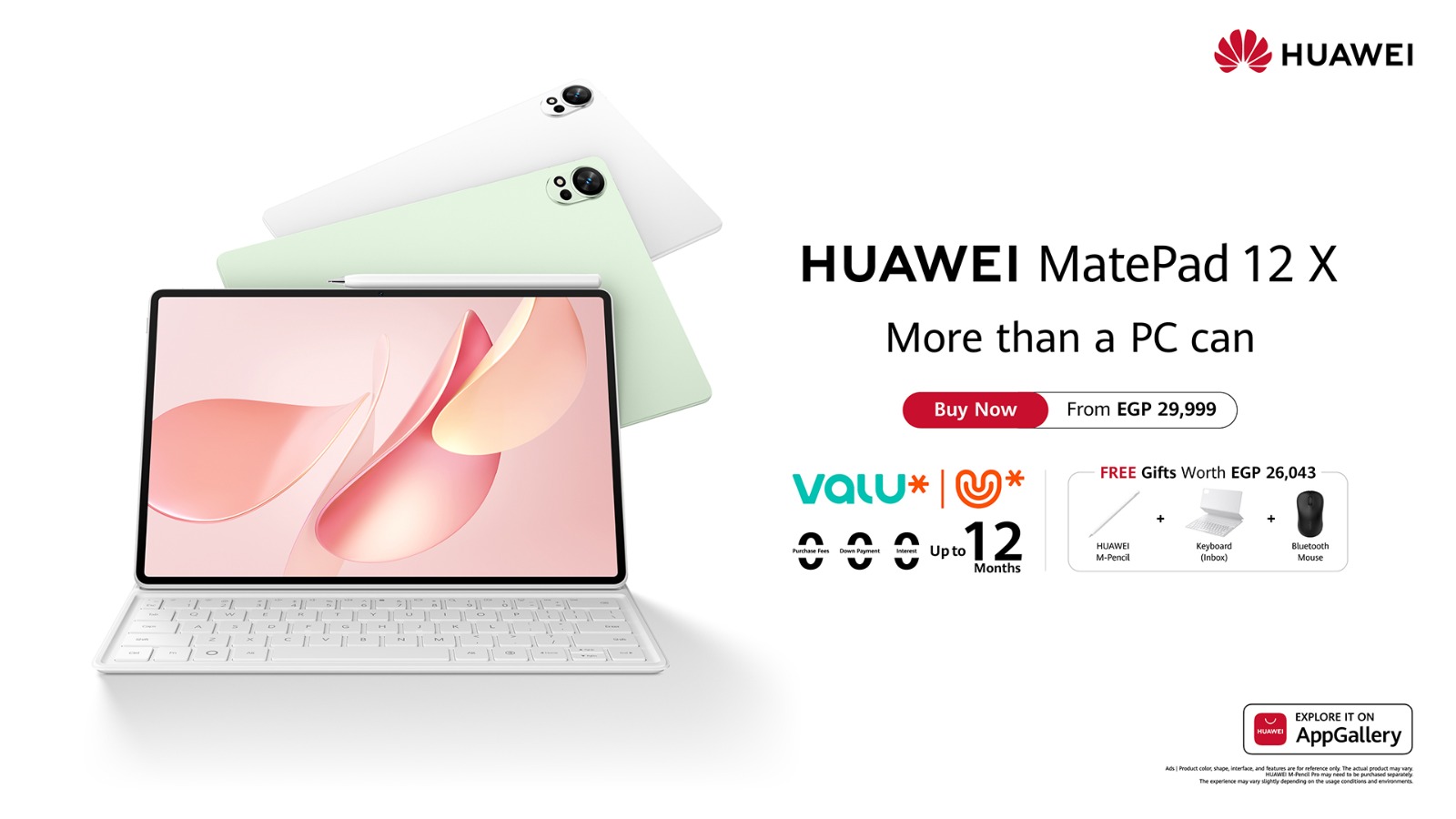 ولتعزيز سهولة الوصول، يمكن للمستخدمين الآن شراء جهاز HUAWEI MatePad 12 X بسعر يبدأ من 29,999 جنيه مصري لنسخة standard screen. ويُمكن للعملاء الشراء مع شركة ڤاليو بدون فوائد وبدون مقدم، مع خطط سداد مرنة تصل إلى 12 شهرًا. ويتوفر هذا العرض من خلال متاجر هواوي HES، والمتجر الإلكتروني، وعدد من الموزعين المعتمدين.