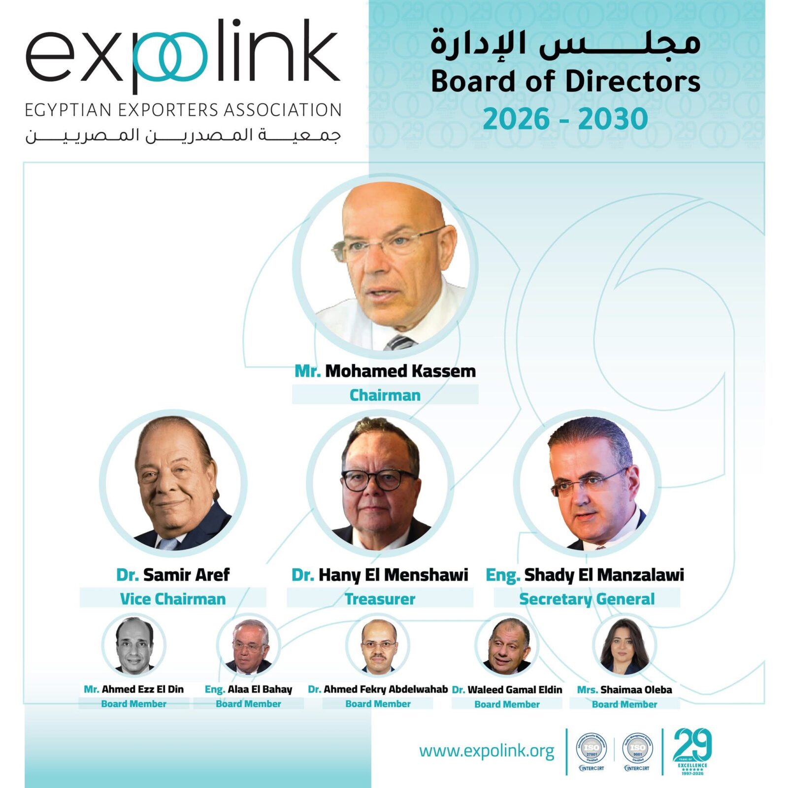 أسفرت انتخابات الجمعية العمومية لـ جمعية المصدرين المصريين – إكسبولينك عن اختيار مجلس إدارة جديد لقيادة الجمعية خلال الدورة الممتدة من عام 2026 وحتى 2030، وذلك في إطار تعزيز دور الجمعية في دعم وتنمية الصادرات المصرية.