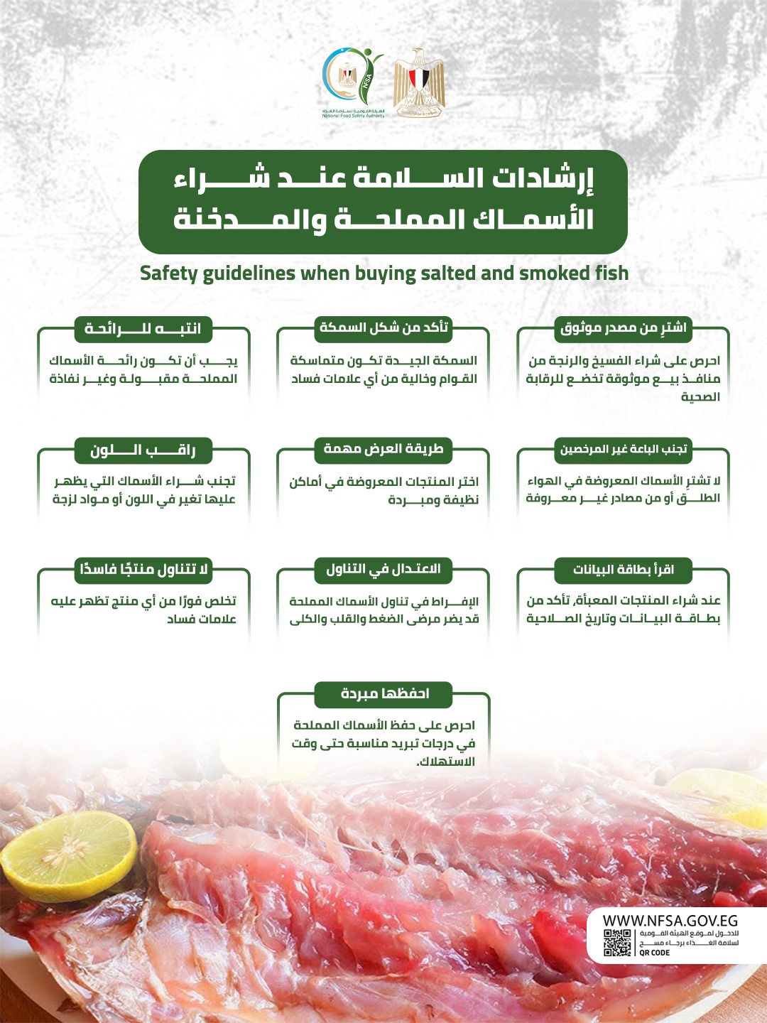 في إطار حرص الهيئة القومية لسلامة الغذاء على حماية صحة المستهلكين، ومع اقتراب احتفالات عيد الفطر المبارك وما يصاحبها من زيادة الإقبال على تناول الأسماك المملحة مثل الفسيخ والرنجة، تقدم الهيئة مجموعة من الإرشادات والتوصيات المهمة لضمان سلامة الغذاء والحد من مخاطر التسمم الغذائي المرتبطة بسوء تداول أو تصنيع هذه المنتجات.
